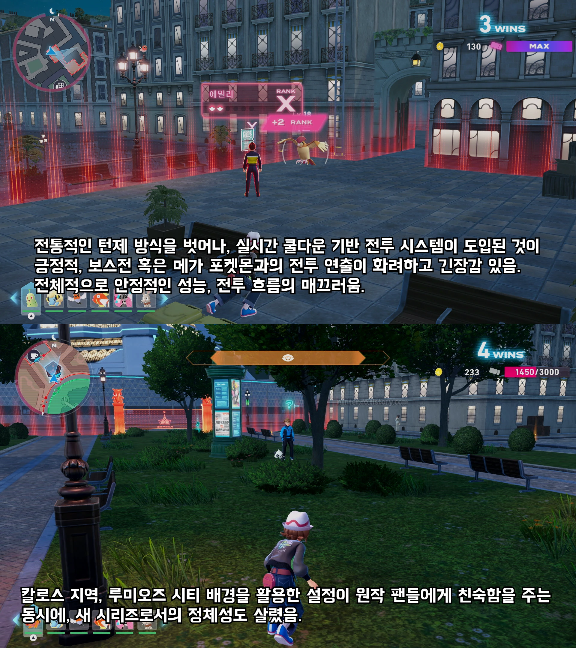 - 몰입도 높은 도시 경험 (미르시티 재해석): 단일 지역에 집중했음에도 불구하고, 미르시티의 재해석은 압도적인 몰입감을 선사했습니다. TheSixthAxis (10/10)는 이 게임을 "최고의 포켓몬 게임"으로 꼽으며, 미르시티에서의 도시 생활을 아름답게 보여주며 "플레이어의 관심을 사로잡는다"고 극찬했습니다. GamesRadar+는 "포켓몬 애니메이션이 우리에게 보여줬던 그 꿈"이 바로 이 게임에 있다고 언급하며 팬들의 만족감을 대변했습니다.